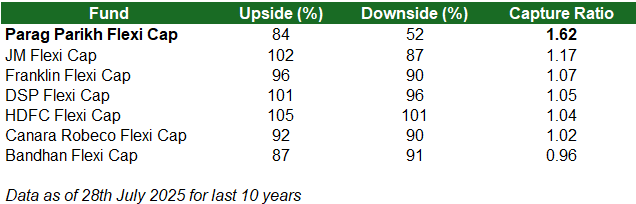 Parag Parikh Flexi Cap has the best downside protection - even though it never beats the market during rallies.