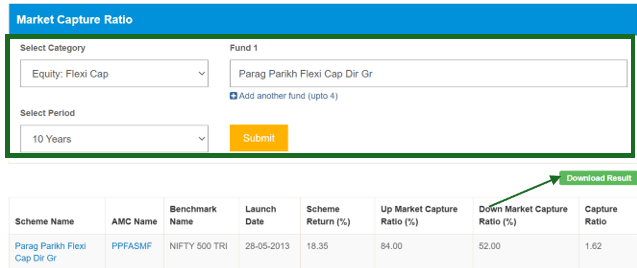 2. In "Select Category," choose Equity: Flexi Cap (or your fund category) 3. In “Fund 1,” select the name of your fund (e.g., Parag Parikh Flexi Cap Dir GR) 4. Set time period to “10 years” or your desired time period from dropdown 5. Click Submit to view the table and Click Download Result to keep a copy You can compare up to 5 funds at once. Super helpful when choosing between similar-looking options. Quick note: If you get an error that means a fund you selected was not launched till then, so you need to change the selected period to get the data. Here's what you learned today: