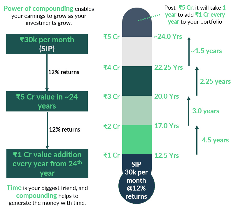 The faster you get to your first ₹1 Cr, the sooner compounding can take over. And that’s why early discipline in SIPs matters much more than chasing the “perfect” mutual fund. Your first crore isn’t just about money. It’s about proving to yourself that patience works. It’s about building the discipline of saving first and spending later. Once you’ve done that, the journey ahead feels lighter because compounding starts carrying the weight for you. The Power of Compounding After ₹1 CroreOnce you’ve pushed your way to the first crore, something magical happens: the money itself starts doing the heavy lifting. Think of your first ₹1 crore as your ticket. Once you have it, every future crore comes faster - sometimes in half the time, sometimes in a fraction of it. In the beginning, it was your savings that mattered most. But after ₹1 Cr, the returns on your investments start outpacing your monthly contributions. Example – Let's say you start investing ₹30,000/month SIP @12% returns (that too even without step up SIPs)Here is how the portfolio grows along with how long it takes to achieve