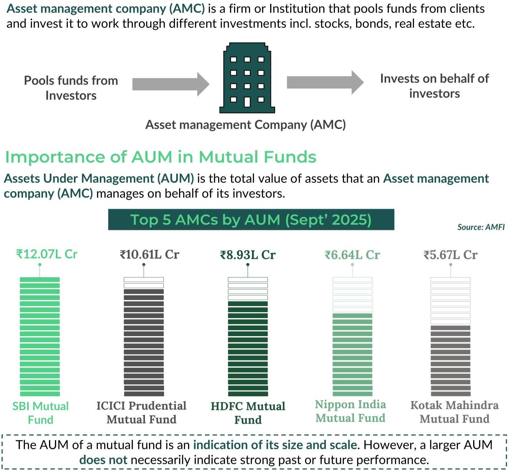 Simple analogy: If mutual funds were schools, AMC is the principal who runs everything. AUM (Assets Under Management): AUM = Total money an AMC manages Does bigger AUM = better fund? Not always. A large AUM indicates size and scale, but doesn't guarantee better returns. What matters more: