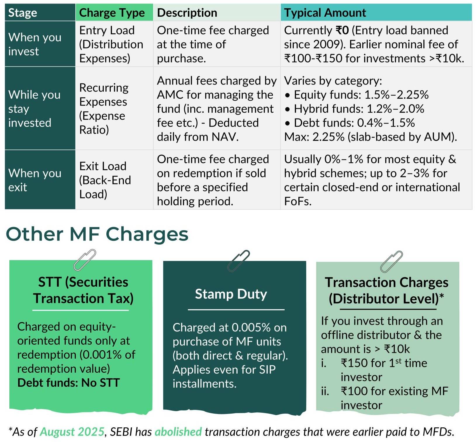 5. Mutual Fund Charges: What You're Actually PayingEvery mutual fund deducts charges. Here's what you need to know: A. Entry Load (Distribution Expenses) - BANNED: Currently ₹0 (Entry load banned since 2009). Earlier, you paid ₹100-₹150 for investments >₹10K. B. Expense Ratio (Annual Fee): Annual fee charged by AMC for managing the fund (includes management fee, operational costs, etc.). Deducted daily from NAV - Lower expense ratio = Better for you (more returns stay with you) Current rates: