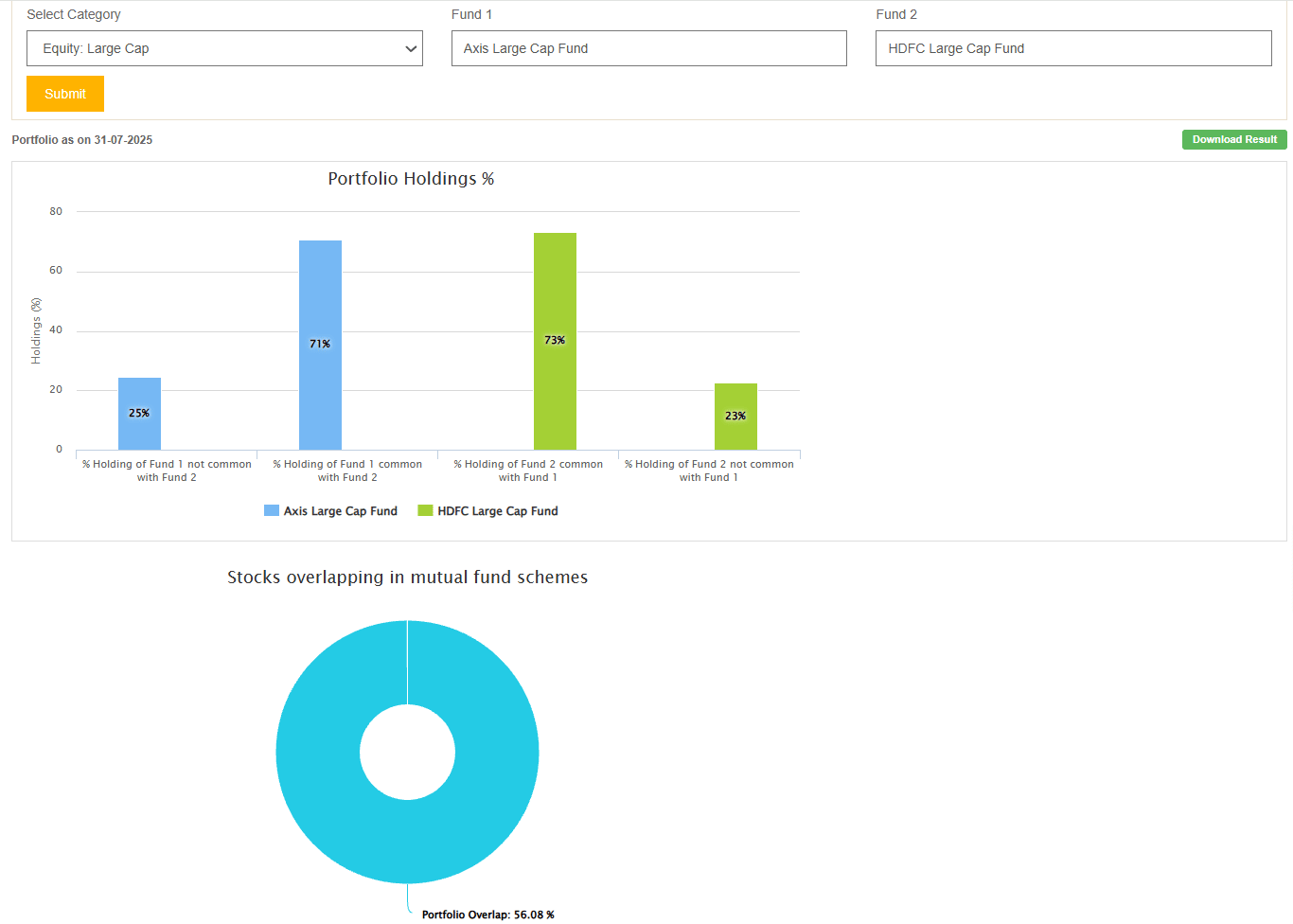 Because trust me, you don’t want to discover this after a market downturn. 3 Things To Understand About Fund Overlap (And How To Avoid It)If you want your money to work smarter - not just harder - you’ll need to track a few things. #1 – What is Fund Overlap?Fund overlap simply means the percentage of common stocks between two mutual funds. Say both your funds are holding Reliance, HDFC Bank, and Infosys in large quantities. Even if you own different funds from different AMCs, at the end of the day you’re betting on the same businesses. 👉 In the example we checked (image below), two funds had a 56.1% overlap. That means more than half the portfolio was running in circles. That’s not diversification - that’s duplication. #2 – Why Too Much Overlap Hurts YouNow, you might say - “But these are good companies, right?” Sure, they are. But the whole point of diversification is to spread risk across different sectors, themes, and styles. If one sector crashes (say banking or IT), you don’t want your entire portfolio taking the same hit. Too much overlap means: