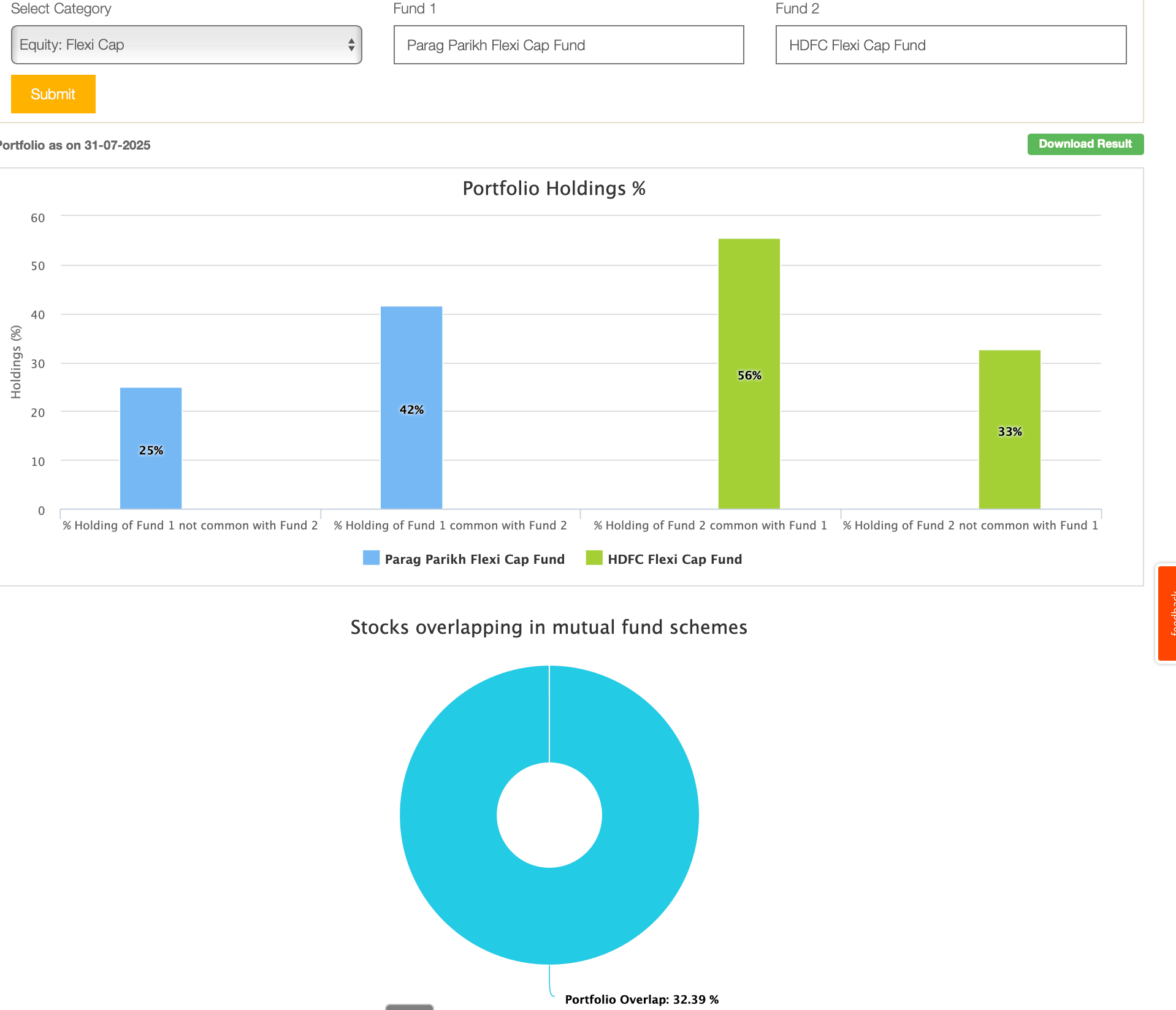 2. Pick the category of fund you want to compare a. Enter Fund 1 name e.g., 'Axis Large Cap Fund' b. Enter Fund 2 name e.g., 'HDFC Large Cap Fund' c. Click on Submit You’ll see the percentage overlap between the two funds. In Rohit's case, 'Axis Large Cap Fund' and 'HDFC Large Cap Fund' had 56.08% overlap. If it’s high (say 40% or more), you need to pause and think - are you really diversifying, or are you stuck with the same portfolio? Now you can do this for any category, let's take an example in the Flexi Cap space: Parag Parikh Flexi Cap and HDFC Flexi Cap has 32.39% portfolio overlap. P.S - No recommendation of either funds or Advisorkhoj, no affiliation. Only for educational purposes. Here’s what you learned today: