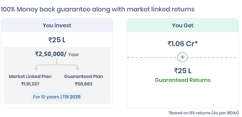 So while the convenience looks attractive, you’re paying a very high “price of simplicity.” Now let's see the impact of Term Insurance + Mutual Fund combo for the same ₹25 lakhs premium paid over the 10 years investment period. #2 - Mutual Fund + Term Insurance = The Winning ComboTerm insurance strips away the “investment” and focuses purely on protection. It’s simple, affordable, and gives your family peace of mind. Example: